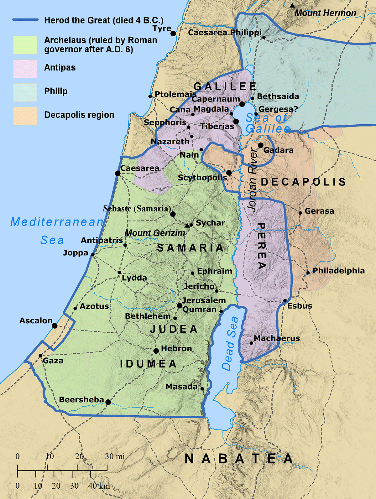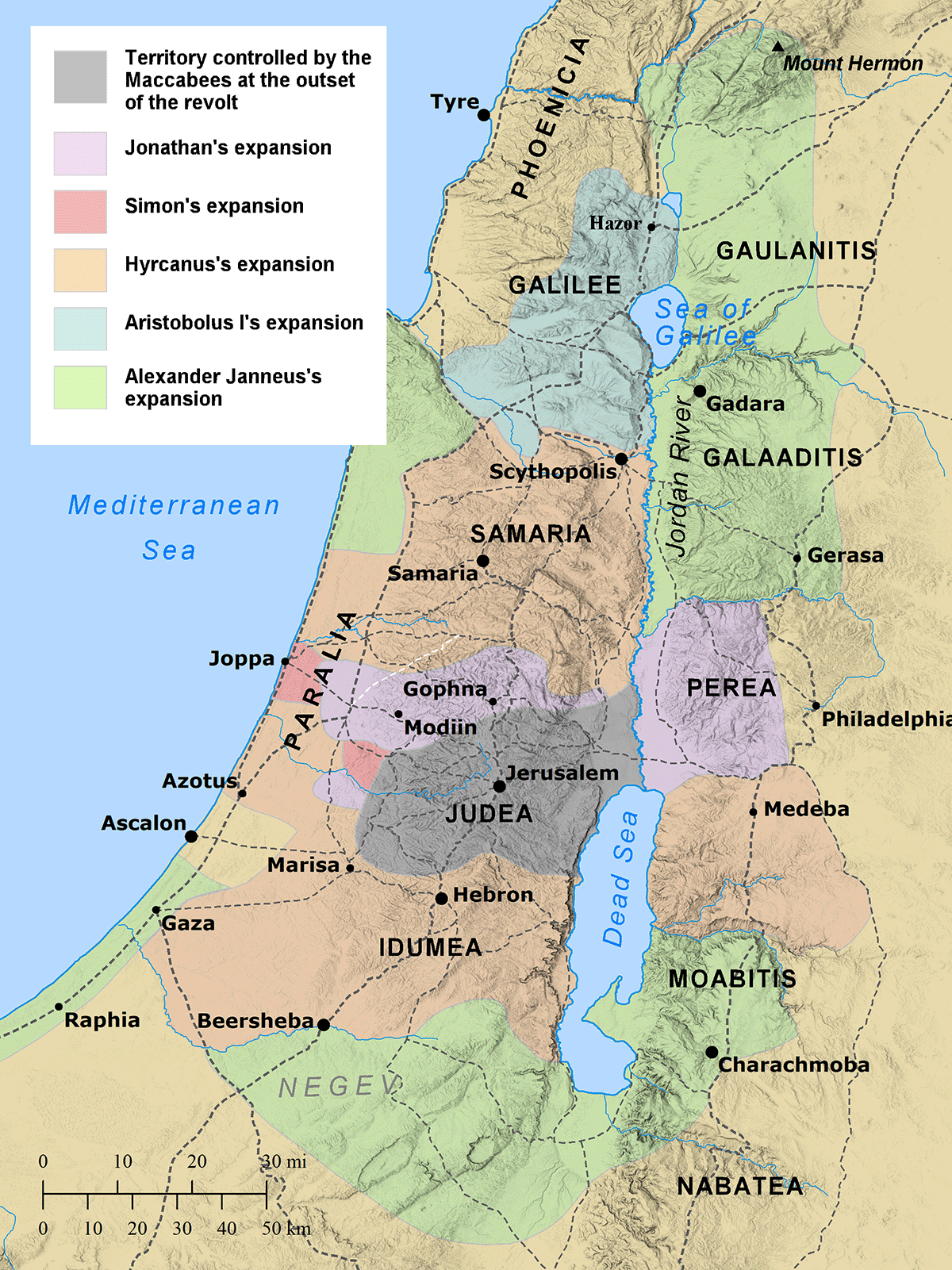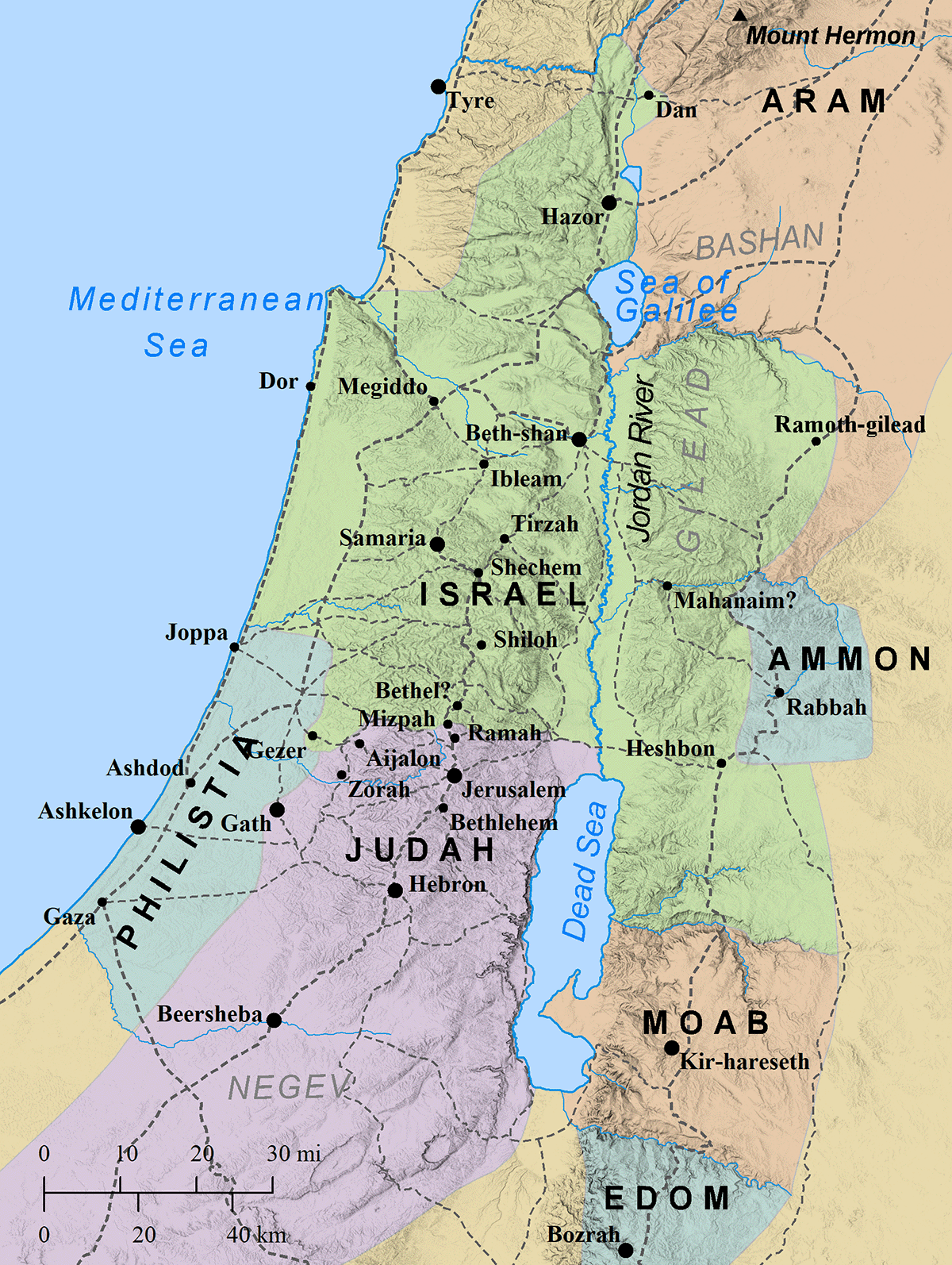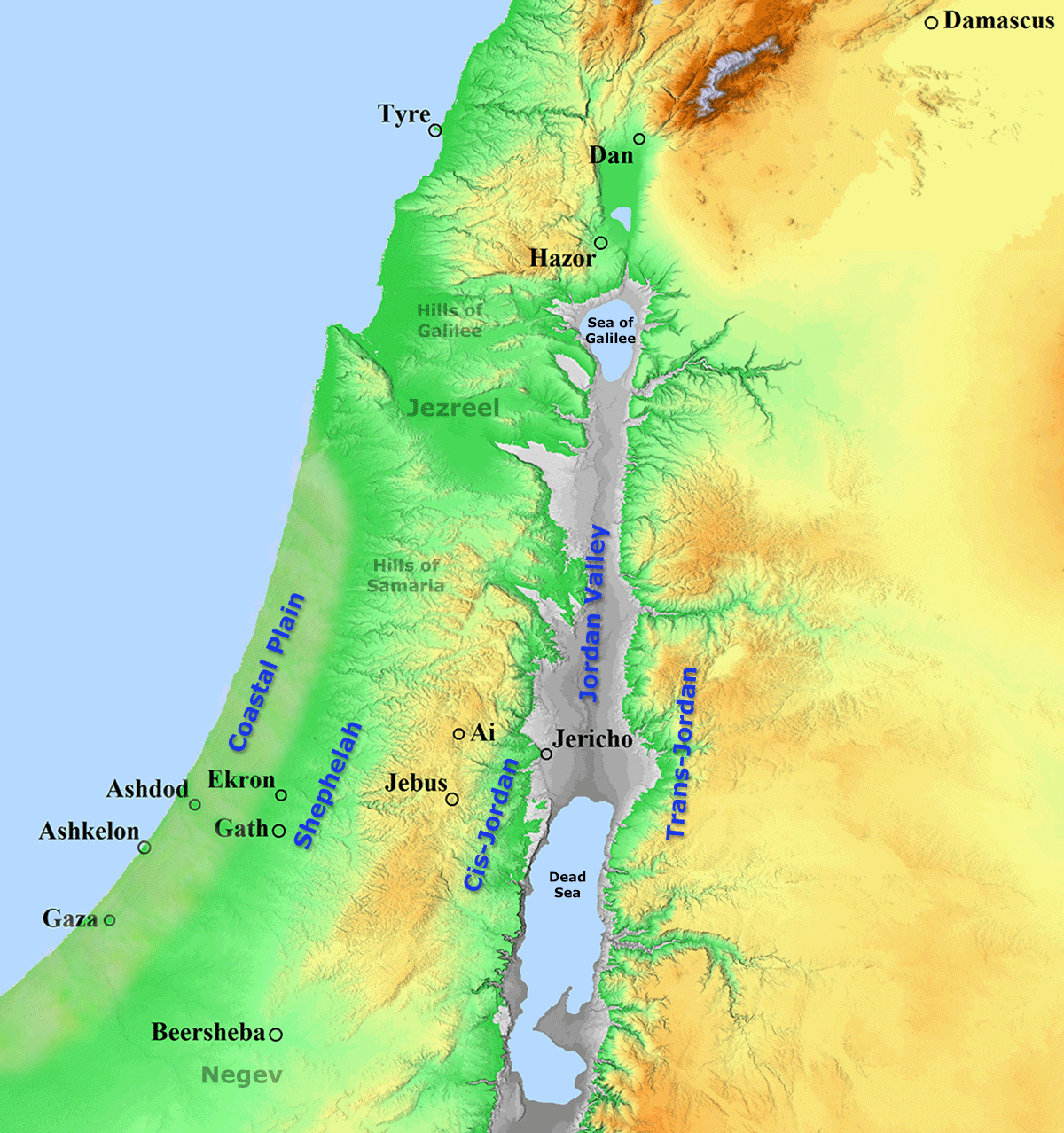 One way to understand Israel's topography is to divide the land into five longitudinal zones. From west to east, the longitudinal zones include: the Coastal Plain, the Shephelah, the Cis-Jordan, the Jordan Valley, and the Trans-Jordan. The Coastal Plain is located along the coast of the Mediterranean Sea. There were few natural harbors on the Coastal Plain, but the few that it had were famously occupied by the Phoenicians in the north and the Philistines in the south, (the latter with their five city-states: Gaza, Ashkelon, Asdod, Gath, and Ekron). In the middle was a marshy area known as the "Plain of Sharon."