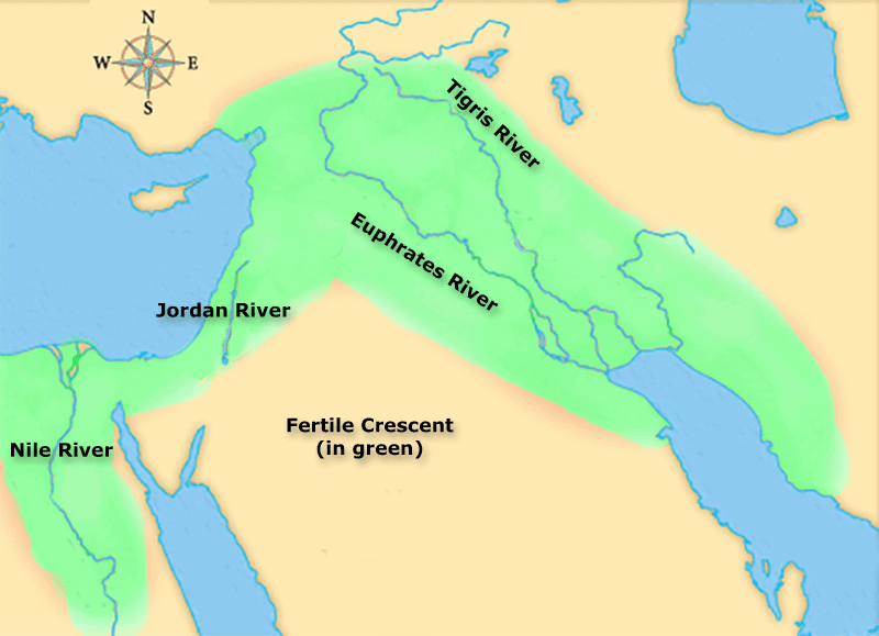 Located within the ancient middle east was a crescent-shaped region ("fertile crescent"), that was home to some of the earliest human civilizations. This region was fertile because it had water sources that were essential for the rise of civilization, ( i.e. the Tigris, Euphrates, Jordan, and Nile rivers).