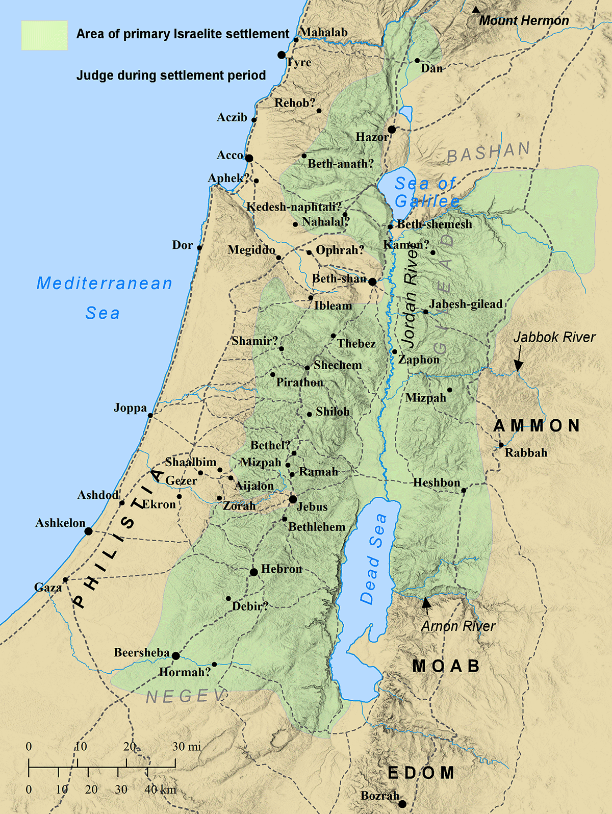 Moving eastward, one next comes to the zone known as the Shephelah. Located about twenty miles inland, the Shephelah ("lowlands") consists of foothills leading from the Coastal Plain to the hill country of the Cis-Jordan. In between the foothills are valleys of various sizes that provide fertile crop-land and local trade routes. The Cis-Jordan is the next longitudinal zone toward the east. "Cis-Jordan" is Latin for "this side of Jordan," (reckoned from Jerusalem). It was the land along the western bank of the Jordan River. (Later, Cis-Jordan came to be used as a term for the entire area ranging from the western bank of the Jordan River to the Mediterranean Sea).