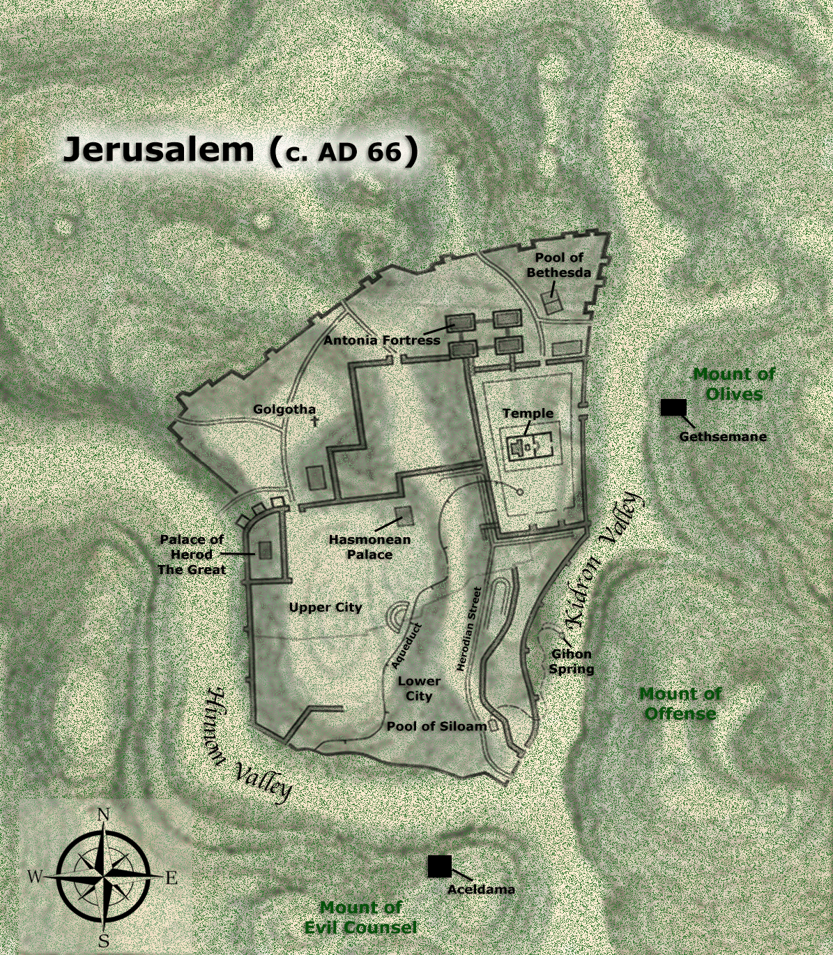 As mentioned above, valleys around Jerusalem were important to its protection. Valleys on the west, south and east of the city were 200-400 feet deep, making attack from these directions virtually impossible. According to Josephus, the vulnerable northern side of the city was protected by a 100 foot tall wall with ninety towers. Although he finally conquered and destroyed Jerusalem in AD 70, the Roman General (and future emperor) Titus declared, "...if it had not been for the internal dissensions, the city could never have been taken."
